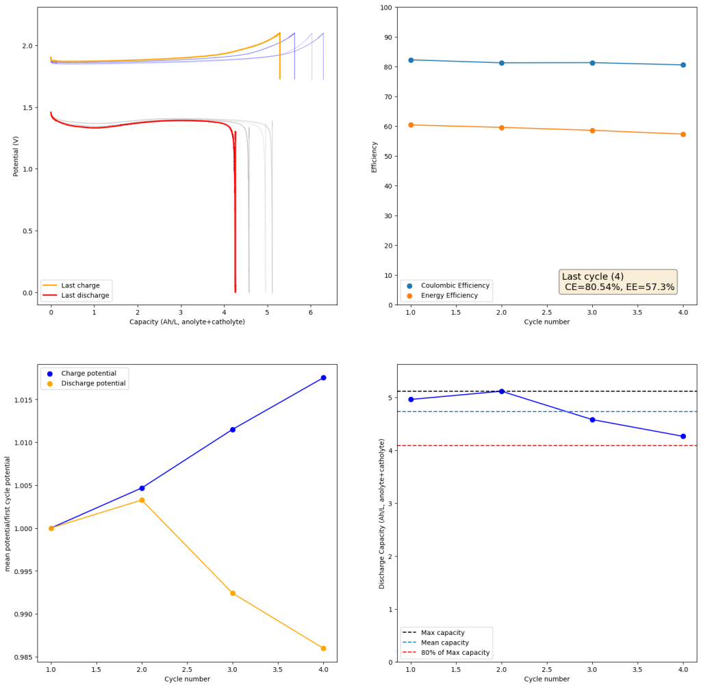 Also, capacities reported by the Chinese group seem to be based only on their catholyte volumes, therefore you have to divide all their values in half if you want to make real comparisons to Ah/L values. They still reach very high capacity values, very close to the actual 100% SOC levels for these systems, although without ever taking the batteries to the Nernst limit. My battery has much higher internal resistance than theirs, which also explains a lot of this difference (as my kinetics are slower, my potential increases much earlier).